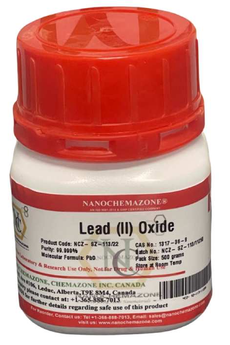 Lead(II) Oxide Powder is generally immediately available in most volumes. Nanochemazone produces to many standard grades when applicable, including Mil Spec (military grade); ACS, Reagent and Technical Grade; Food, Agricultural and Pharmaceutical Grade; Optical Grade, USP and EP/BP (European Pharmacopoeia/British Pharmacopoeia) and follows applicable ASTM testing standards. Typical and custom packaging is available. Additional technical, research and safety (MSDS) information is available as is a Reference Calculator for converting relevant units of measurement.